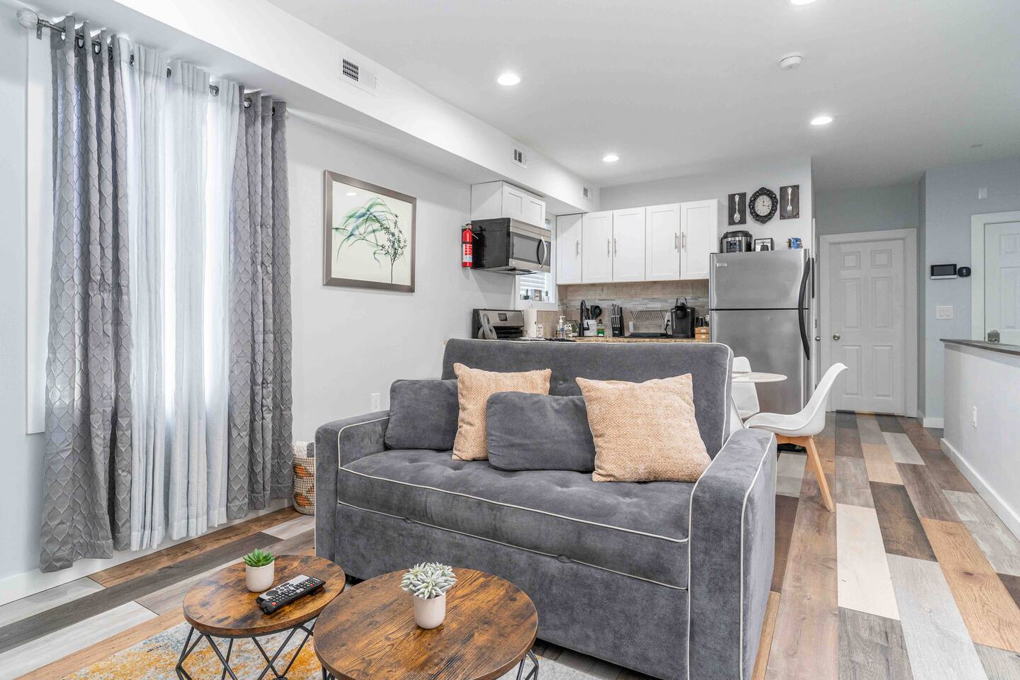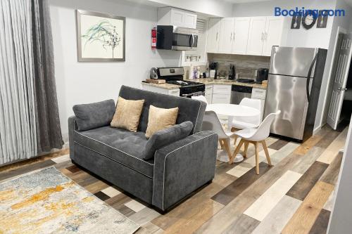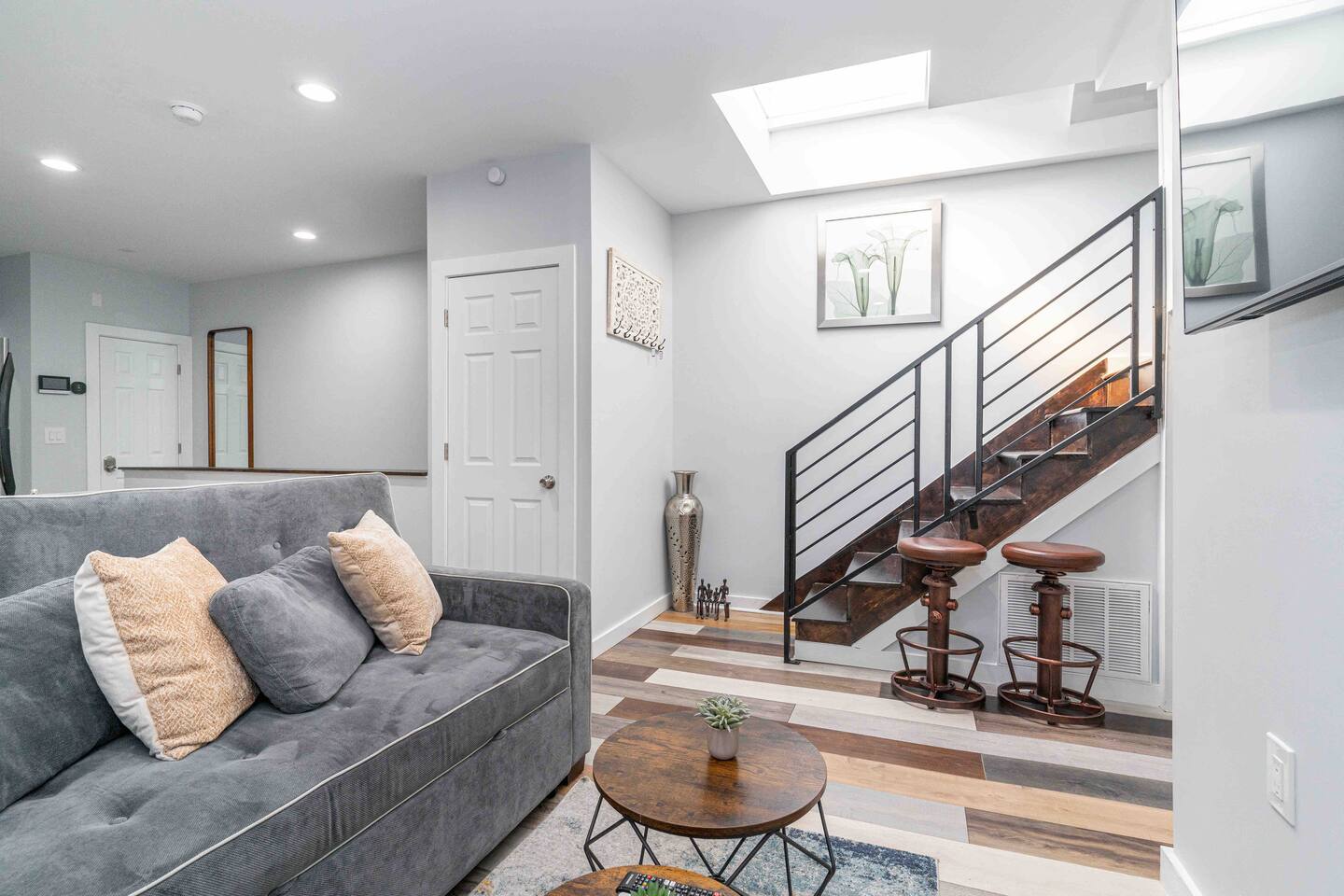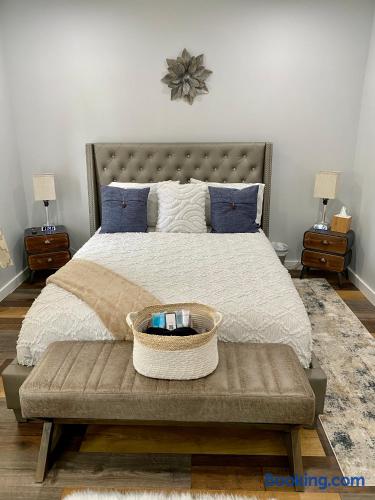 “Welcome to our inviting loft! nestled in a vibrant community, surrounded by parks, restaurants, and shops. This 3rd floor retreat boasts nearly 1000 sq ft of modern living space, featuring 2 bedrooms, a den, 2 bathrooms, and an open concept kitchen and living area. Step into a space adorned with large windows, inviting ample natural light, and a modern air conditioning unit for maximum comfort. The living area offers a cozy sofa bed, a flat screen TV, and tasteful decor, a perfect setting for quality time with friends and family. Sleep in comfort with a king size bed in one room and a queen size bed in the other, both fitted with hotel quality sheets. Each bedroom is equipped with its own flat-screen TV for added entertainment. The well designed kitchen, with white shaker wood cabinets and modern appliances, including a dishwasher, refrigerator, stove, and microwave, is a haven for cooking enthusiasts. Gather around the dining table for 4 to enjoy your culinary creations. Venture upstairs to the spacious den in the attic, featuring a workstation for remote work and comfy sitting puffs for relaxation. The apartment comes complete with two modern bathrooms stocked with complimentary toiletries, towels, and essential amenities such as a washing machine, dryer, and ironing facilities. Experience the perfect blend of style and comfort in our thoughtfully designed loft.