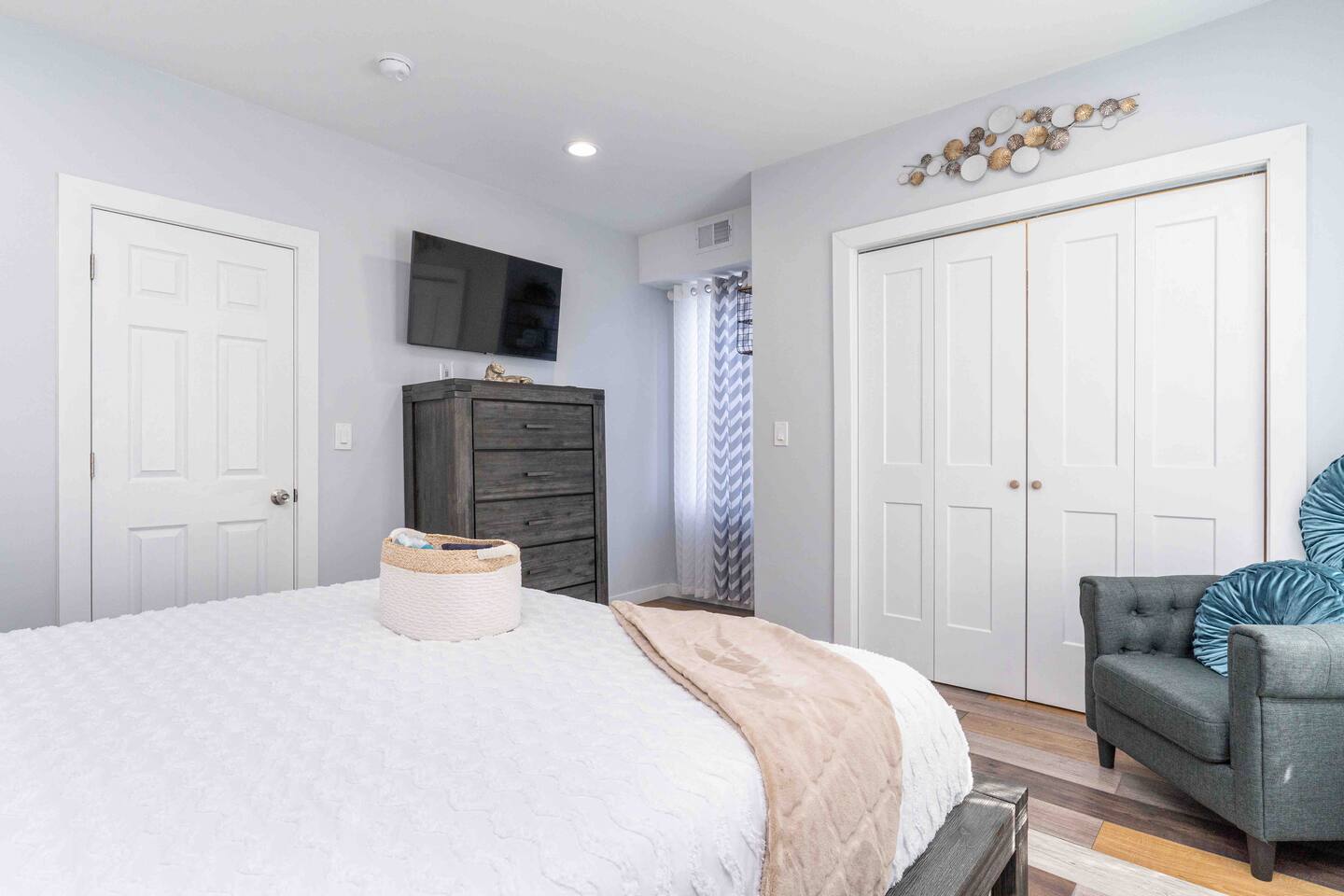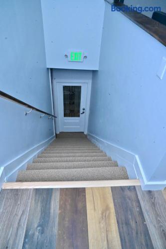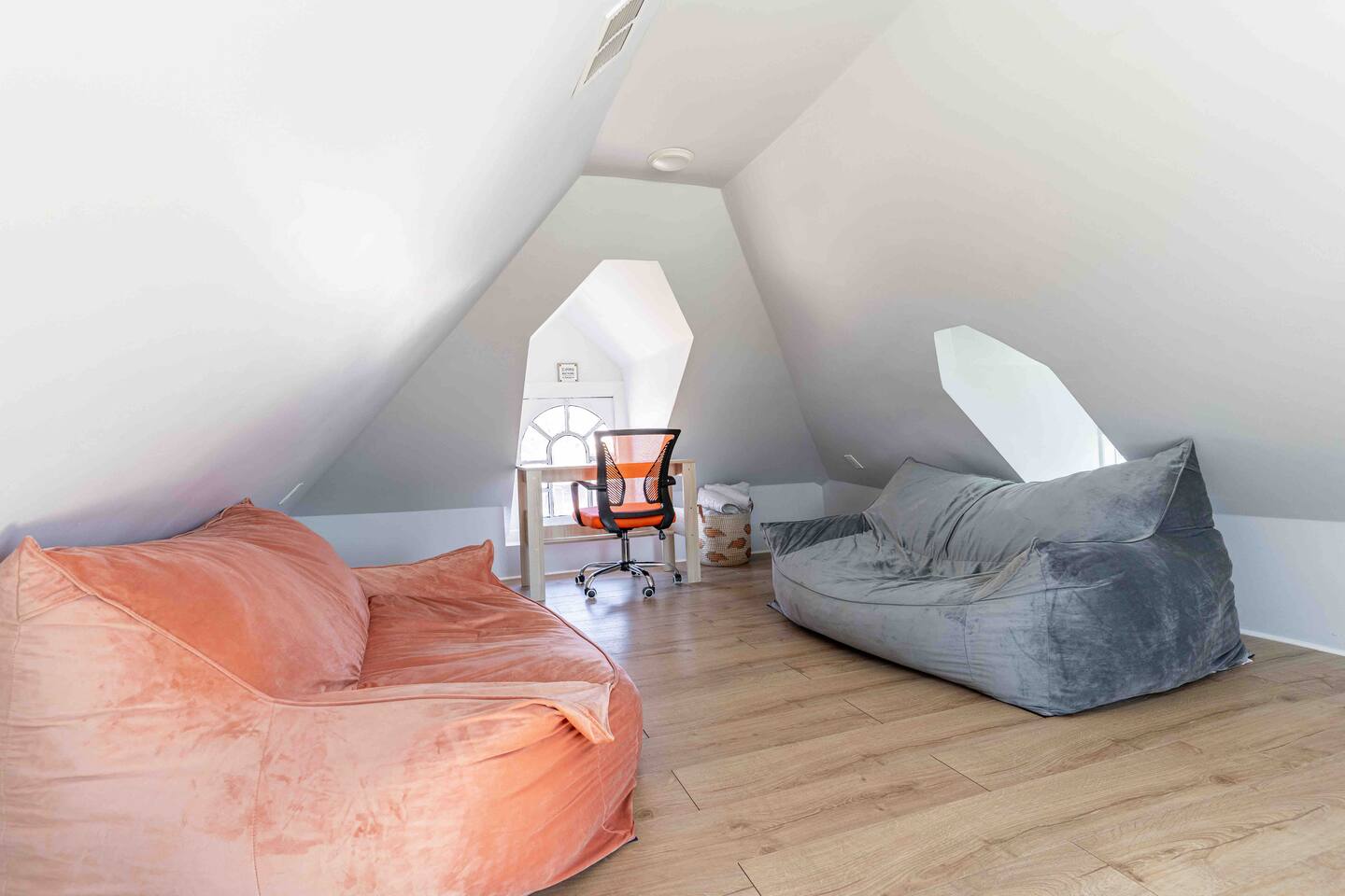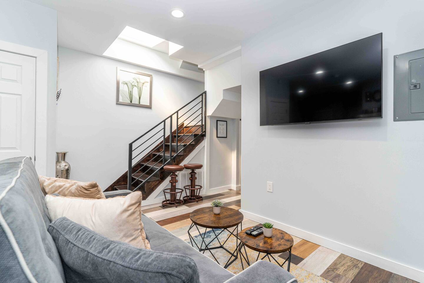 “Welcome to our inviting loft! nestled in a vibrant community, surrounded by parks, restaurants, and shops. This 3rd floor retreat boasts nearly 1000 sq ft of modern living space, featuring 2 bedrooms, a den, 2 bathrooms, and an open concept kitchen and living area. Step into a space adorned with large windows, inviting ample natural light, and a modern air conditioning unit for maximum comfort. The living area offers a cozy sofa bed, a flat screen TV, and tasteful decor, a perfect setting for quality time with friends and family. Sleep in comfort with a king size bed in one room and a queen size bed in the other, both fitted with hotel quality sheets. Each bedroom is equipped with its own flat-screen TV for added entertainment. The well designed kitchen, with white shaker wood cabinets and modern appliances, including a dishwasher, refrigerator, stove, and microwave, is a haven for cooking enthusiasts. Gather around the dining table for 4 to enjoy your culinary creations. Venture upstairs to the spacious den in the attic, featuring a workstation for remote work and comfy sitting puffs for relaxation. The apartment comes complete with two modern bathrooms stocked with complimentary toiletries, towels, and essential amenities such as a washing machine, dryer, and ironing facilities. Experience the perfect blend of style and comfort in our thoughtfully designed loft.